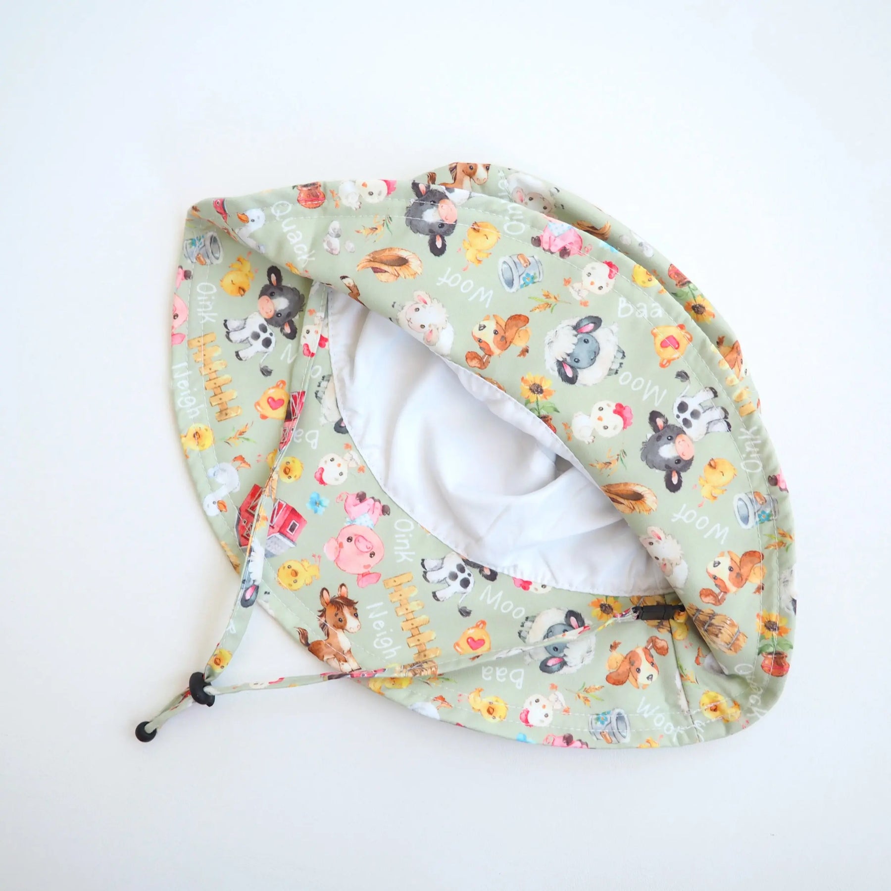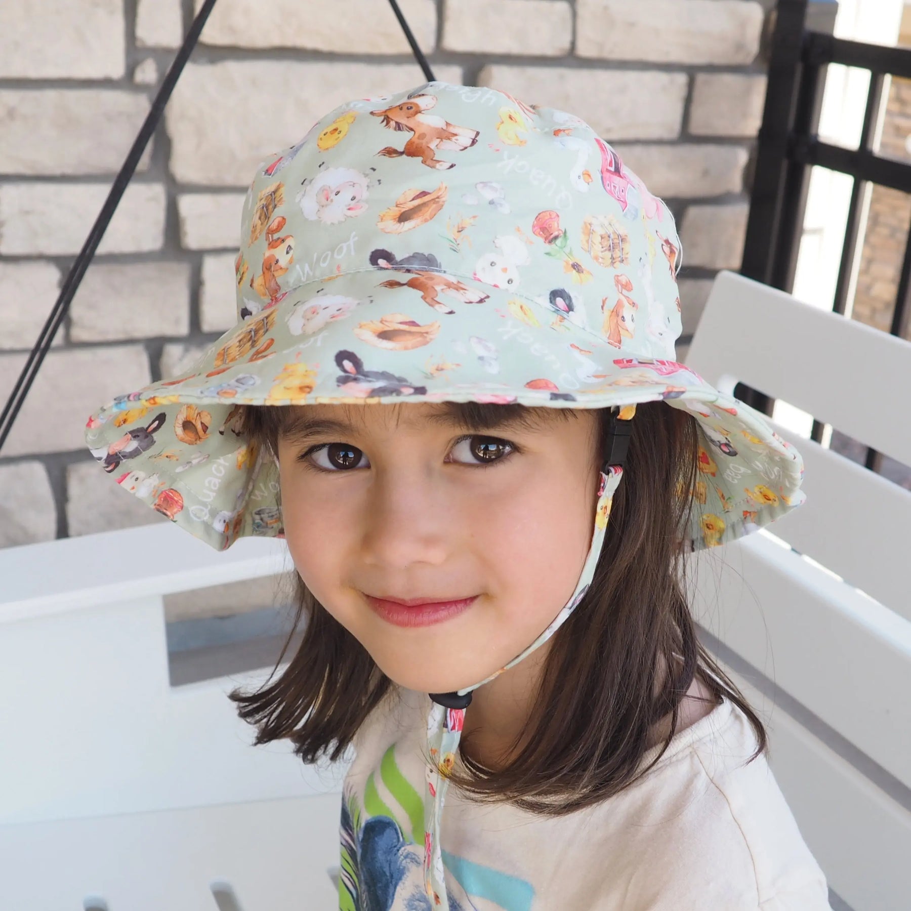 The farm-themed design makes this kids hat especially appealing for spring and summer collections, bringing a fun, storybook feel to boutique displays. Whether it’s a trip to the park, a family picnic, a beach day, or everyday outdoor play, this toddler hat stays secure thanks to its built-in chinstrap.