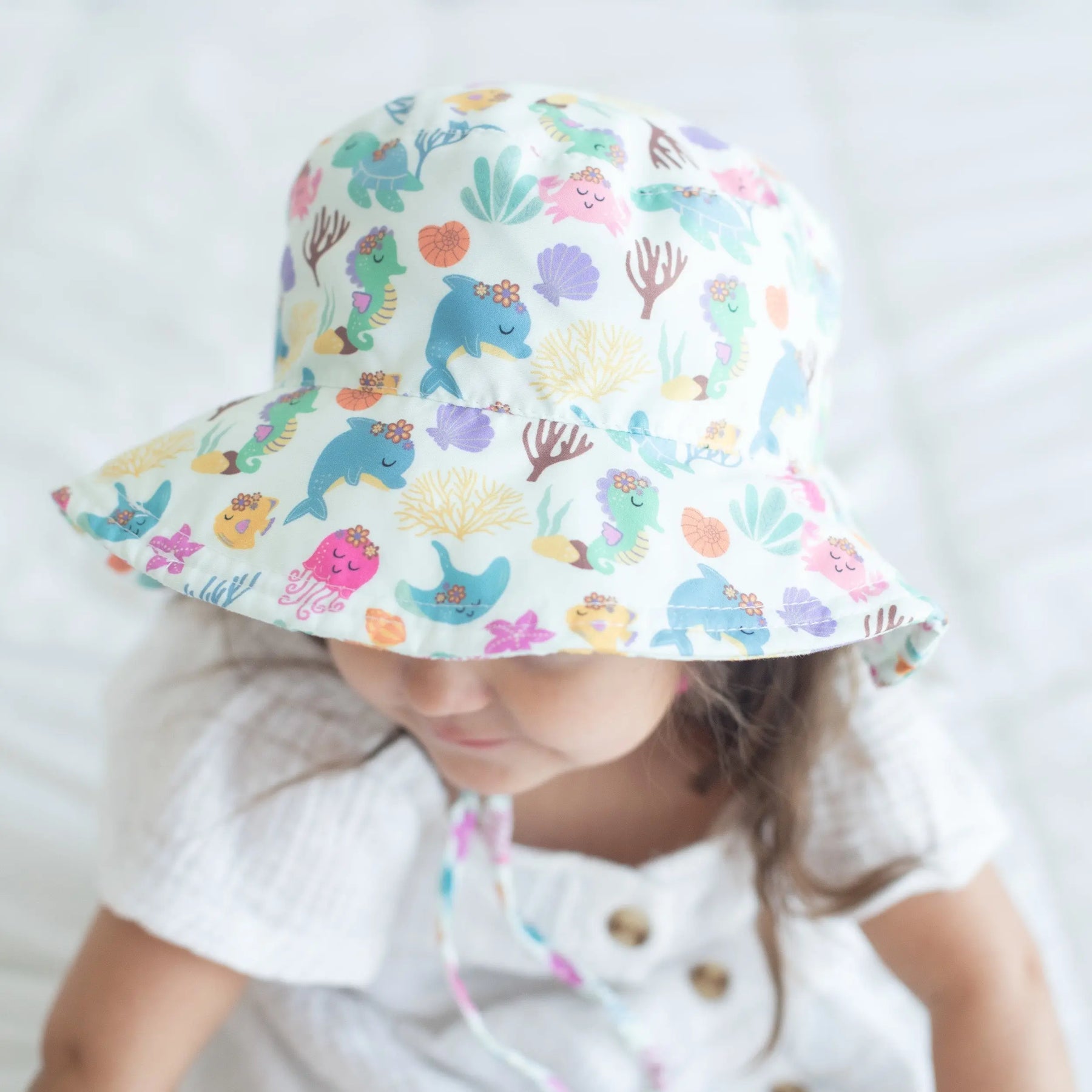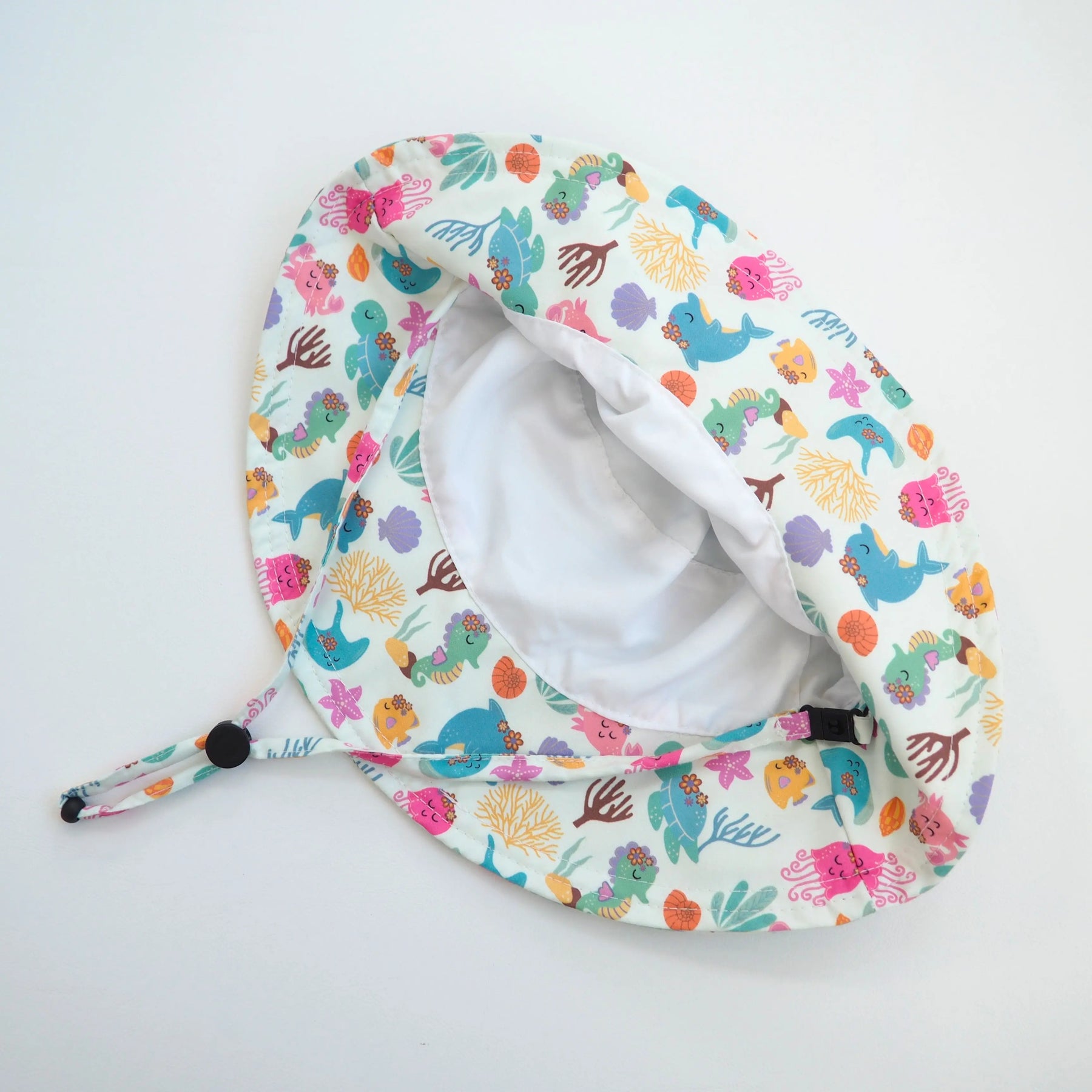 The underwater-inspired print brings a fun, coastal feel to summer outfits, making it an easy standout in boutique displays. Whether families are heading to the beach, pool, playground, or vacation getaway, this toddler hat stays secure thanks to its built-in chinstrap.