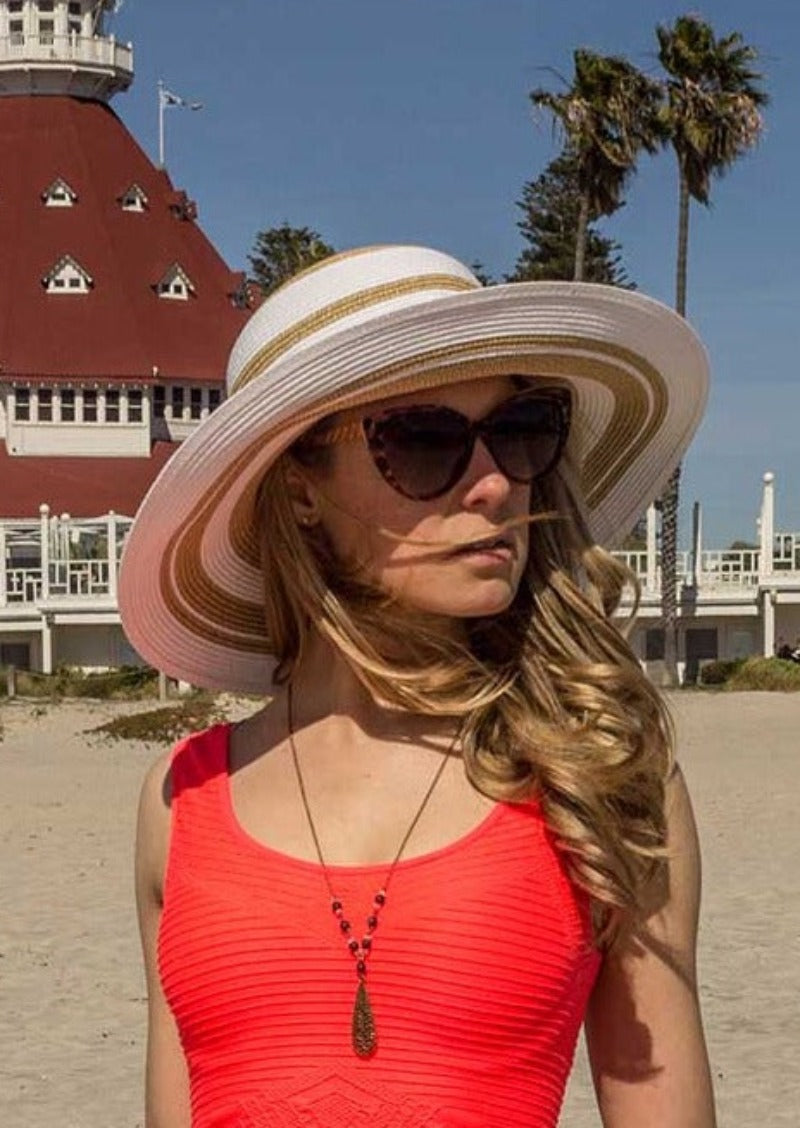 New for Resort/Summer sun hats, our Diana hat provides ultimate sun protection in a lightweight straw weave with a very elegant and stylish striped pattern of cream and shimmery tan straw. The large brim can be adjusted upwards or downwards, per your preference. We love how it provides UPF 50 sun protection without sacrificing style and can be dressed up or down.